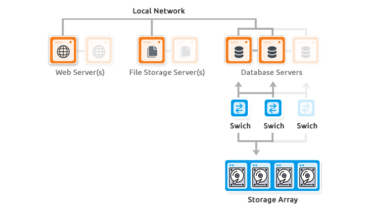 A Storage Area Network (SAN) provides a redundant array of disks seen as a local volume by the servers attached to it, for high availability and faster disk I/O performance than NAS. SAN’s are common virtualization clusters and for providing centralized access to I/O intensive databases.