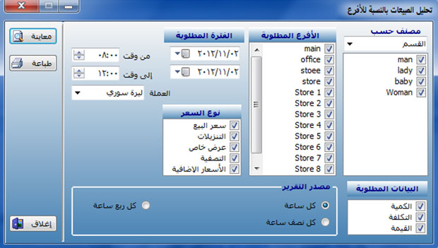 It can compare quantity, value and cost of sales on a monthly or weekly basis and it is classified according to (section or item or season or the manufacturer or vendor or branches, or ….) and it is supported with clarified diagram allowing to study the peak and normal times for each branch and to take an appropriate decision-making.